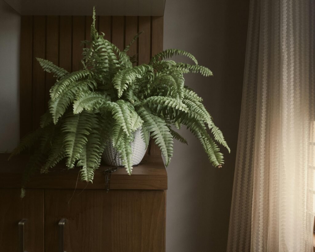 - Banheiro claro: sim, samambaia no banheiro funciona muito bem se houver boa luz e ventilação para evitar mofo.